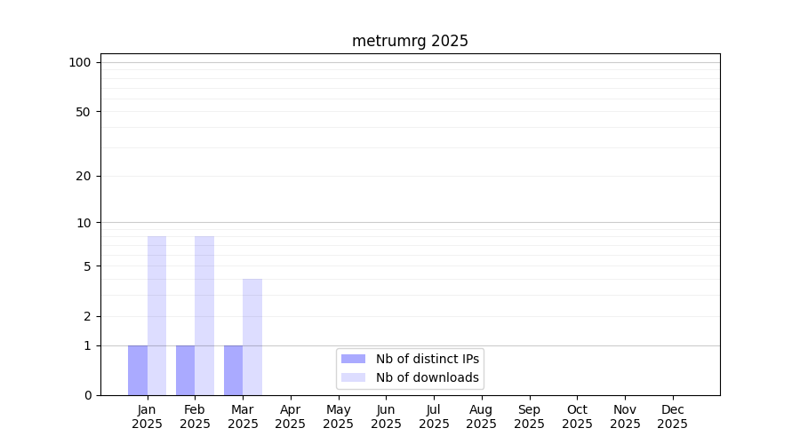 Number of downloads for experiment package metrumrg, year by year, from 2025 back to 2014 (years with no downloads are omitted):