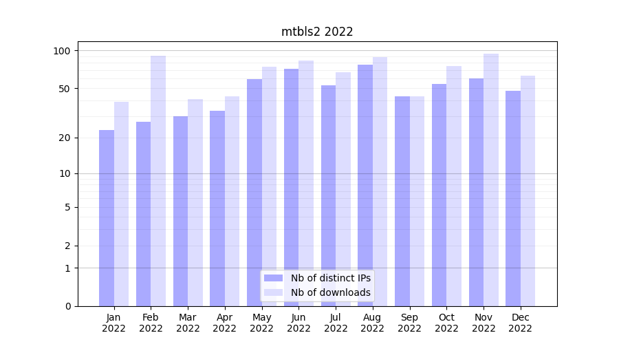 Number of downloads for experiment package mtbls2, year by year, from 2025 back to 2014 (years with no downloads are omitted):