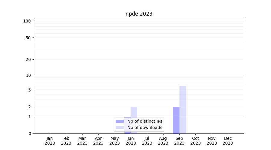 Number of downloads for experiment package npde, year by year, from 2025 back to 2014 (years with no downloads are omitted):