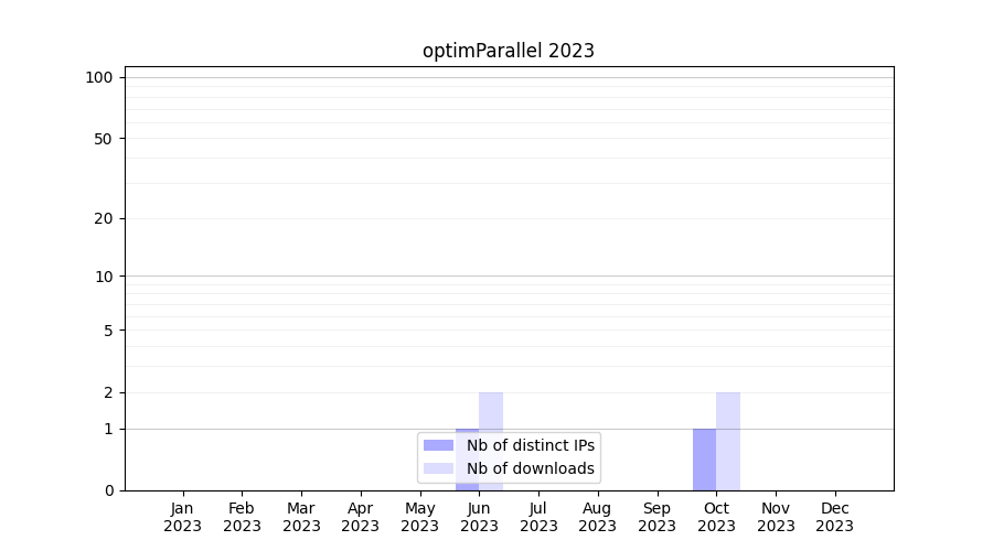 Number of downloads for experiment package optimParallel, year by year, from 2025 back to 2014 (years with no downloads are omitted):