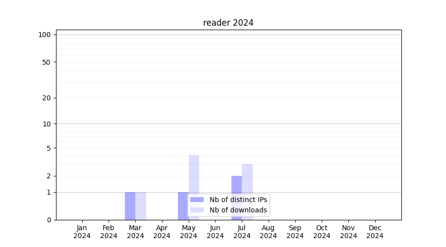 Number of downloads for experiment package reader, year by year, from 2025 back to 2014 (years with no downloads are omitted):
