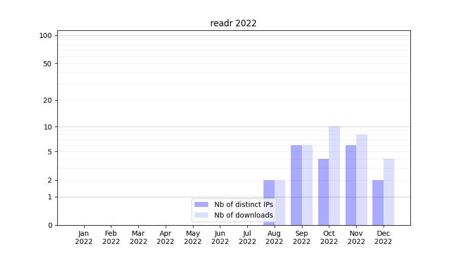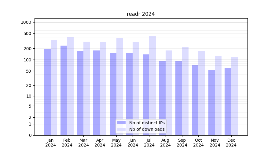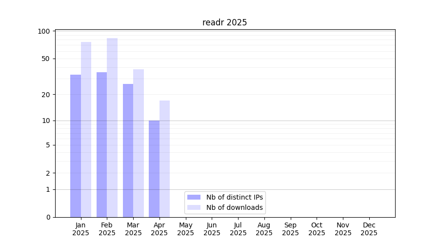 Number of downloads for experiment package readr, year by year, from 2025 back to 2014 (years with no downloads are omitted):