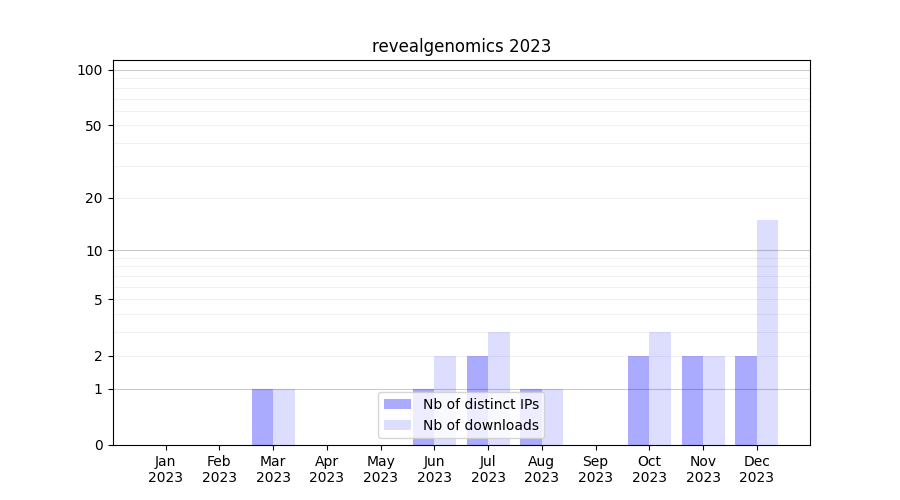 Number of downloads for experiment package revealgenomics, year by year, from 2025 back to 2014 (years with no downloads are omitted):