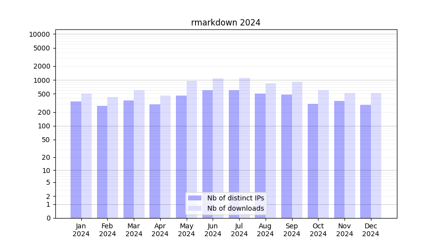 Number of downloads for experiment package rmarkdown, year by year, from 2025 back to 2014 (years with no downloads are omitted):