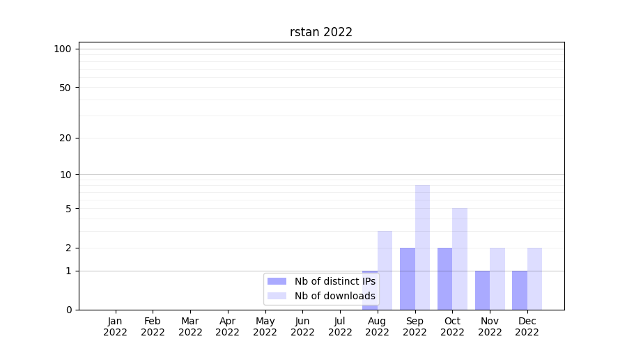 Number of downloads for experiment package rstan, year by year, from 2025 back to 2014 (years with no downloads are omitted):