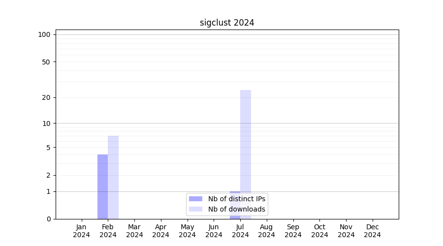 Number of downloads for experiment package sigclust, year by year, from 2025 back to 2014 (years with no downloads are omitted):