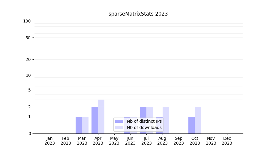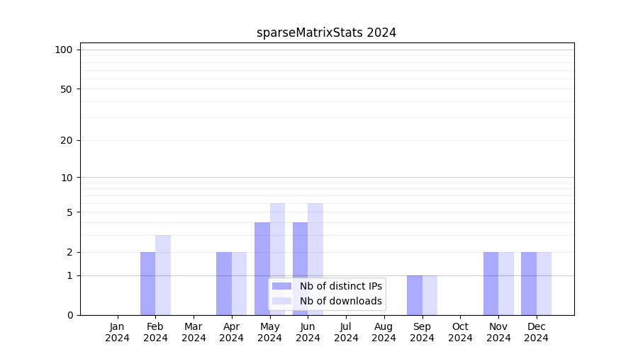 Number of downloads for experiment package sparseMatrixStats, year by year, from 2025 back to 2014 (years with no downloads are omitted):