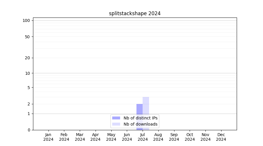 Number of downloads for experiment package splitstackshape, year by year, from 2025 back to 2014 (years with no downloads are omitted):