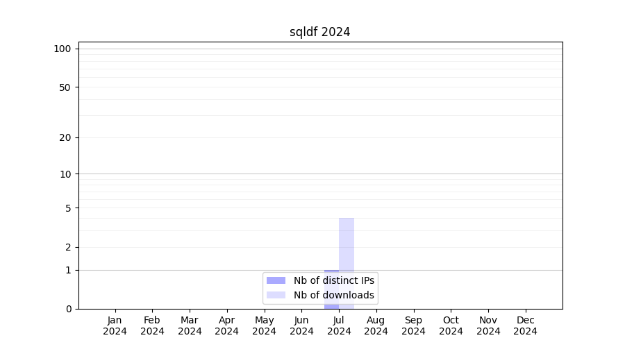 Number of downloads for experiment package sqldf, year by year, from 2025 back to 2014 (years with no downloads are omitted):