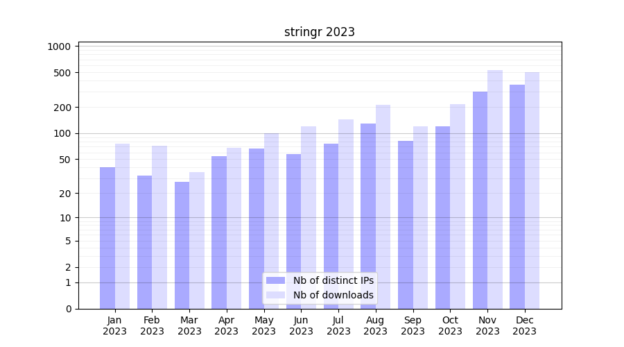 Number of downloads for experiment package stringr, year by year, from 2025 back to 2014 (years with no downloads are omitted):
