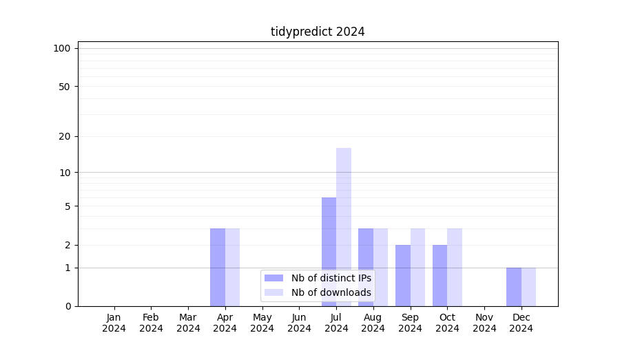 Number of downloads for experiment package tidypredict, year by year, from 2025 back to 2014 (years with no downloads are omitted):