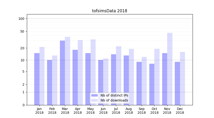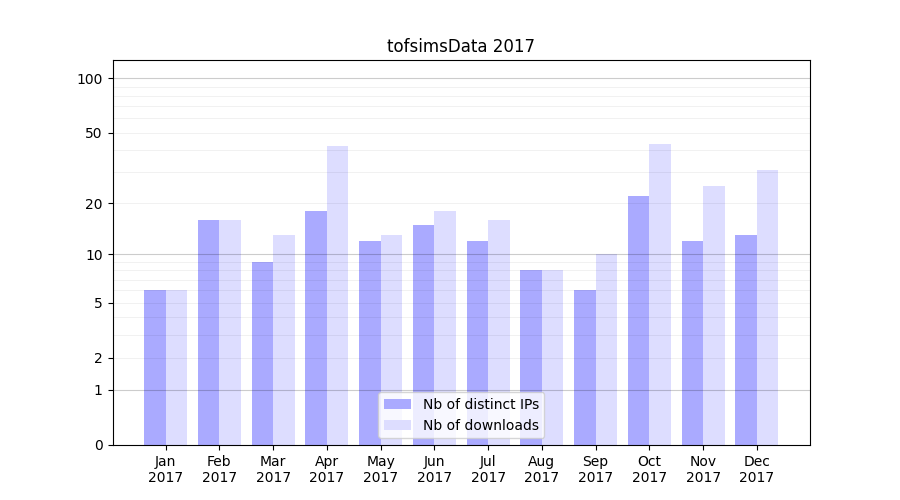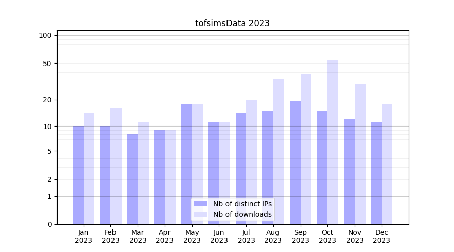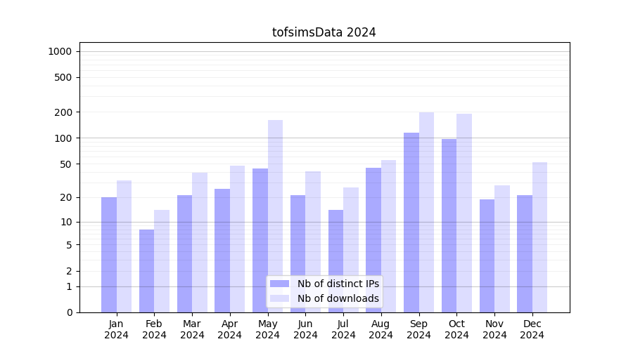 Number of downloads for experiment package tofsimsData, year by year, from 2025 back to 2014 (years with no downloads are omitted):