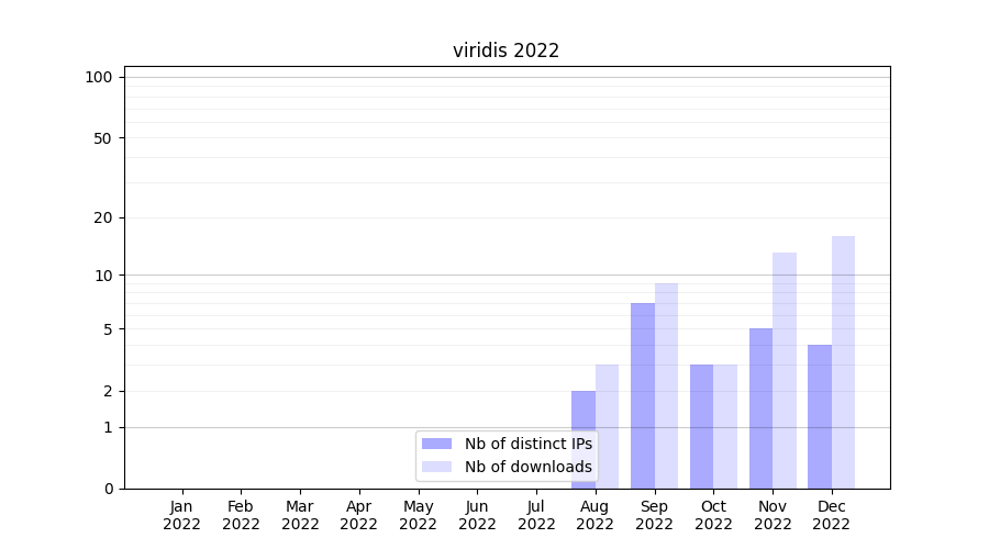 Number of downloads for experiment package viridis, year by year, from 2025 back to 2014 (years with no downloads are omitted):
