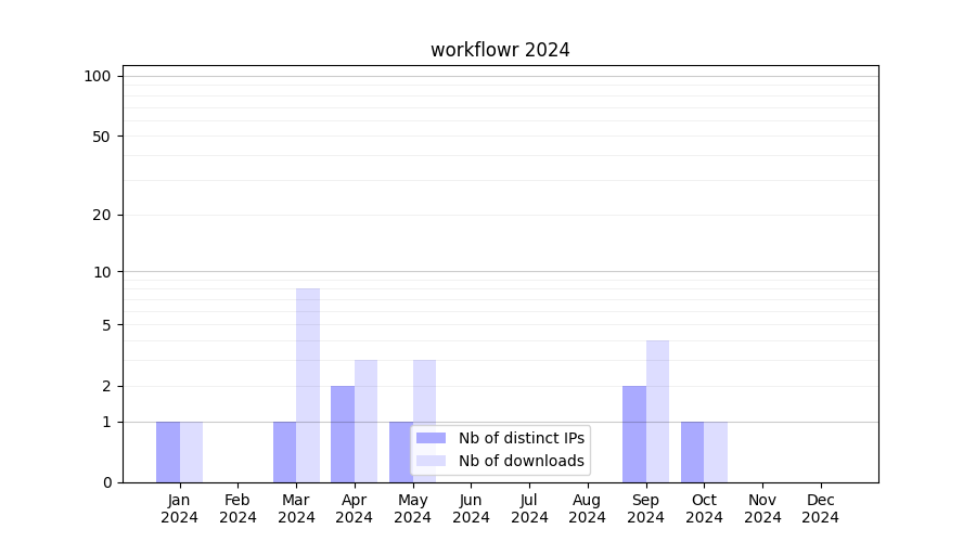 Number of downloads for experiment package workflowr, year by year, from 2025 back to 2014 (years with no downloads are omitted):