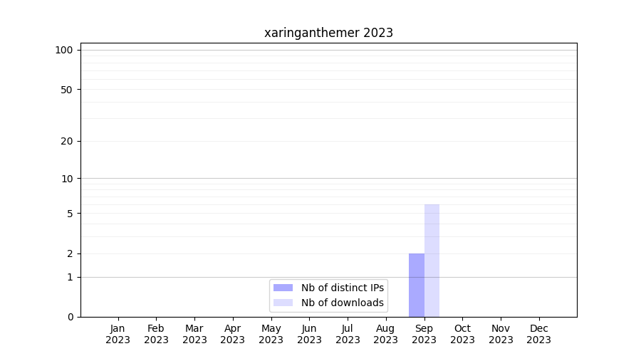 Number of downloads for experiment package xaringanthemer, year by year, from 2025 back to 2014 (years with no downloads are omitted):