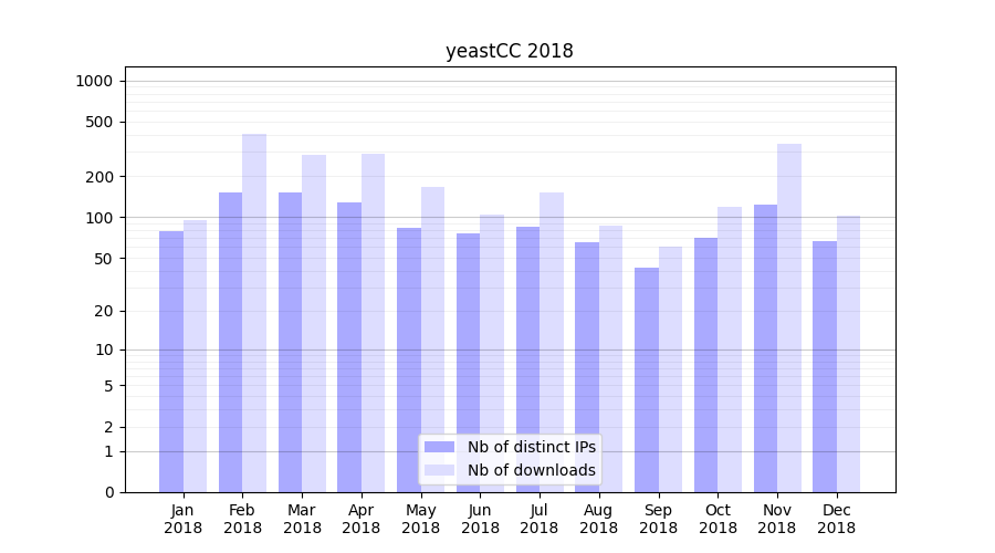 Number of downloads for experiment package yeastCC, year by year, from 2025 back to 2014 (years with no downloads are omitted):