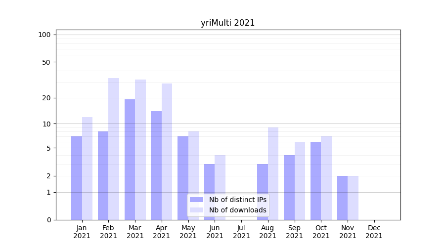Number of downloads for experiment package yriMulti, year by year, from 2025 back to 2014 (years with no downloads are omitted):