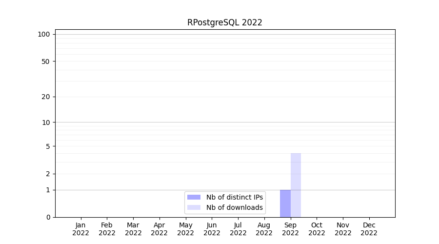 Number of downloads for workflow package RPostgreSQL, year by year, from 2025 back to 2015 (years with no downloads are omitted):