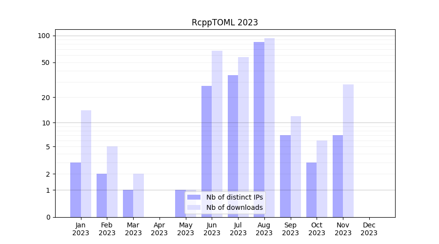 Number of downloads for workflow package RcppTOML, year by year, from 2025 back to 2015 (years with no downloads are omitted):