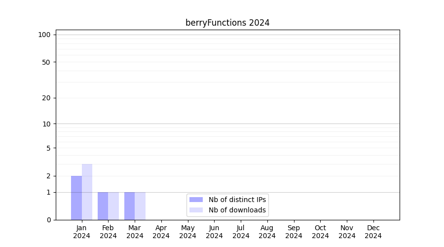 Number of downloads for workflow package berryFunctions, year by year, from 2025 back to 2015 (years with no downloads are omitted):