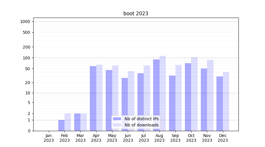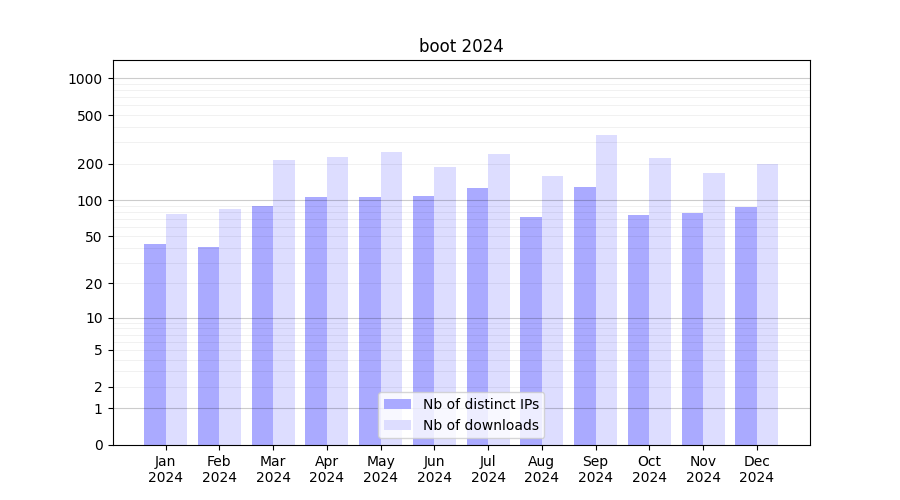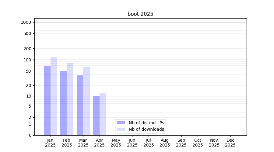 Number of downloads for workflow package boot, year by year, from 2025 back to 2015 (years with no downloads are omitted):