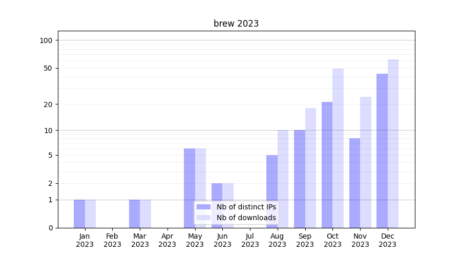 Number of downloads for workflow package brew, year by year, from 2025 back to 2015 (years with no downloads are omitted):