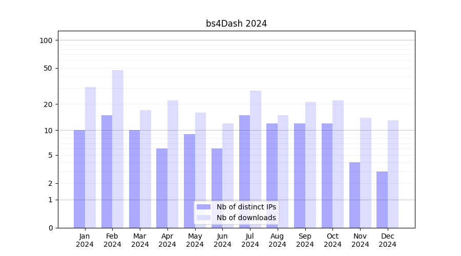 Number of downloads for workflow package bs4Dash, year by year, from 2025 back to 2015 (years with no downloads are omitted):