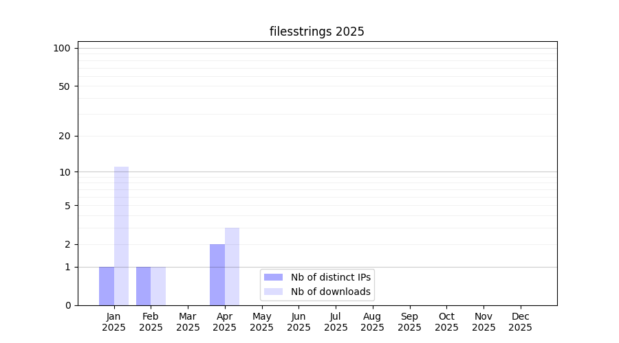 Number of downloads for workflow package filesstrings, year by year, from 2025 back to 2015 (years with no downloads are omitted):