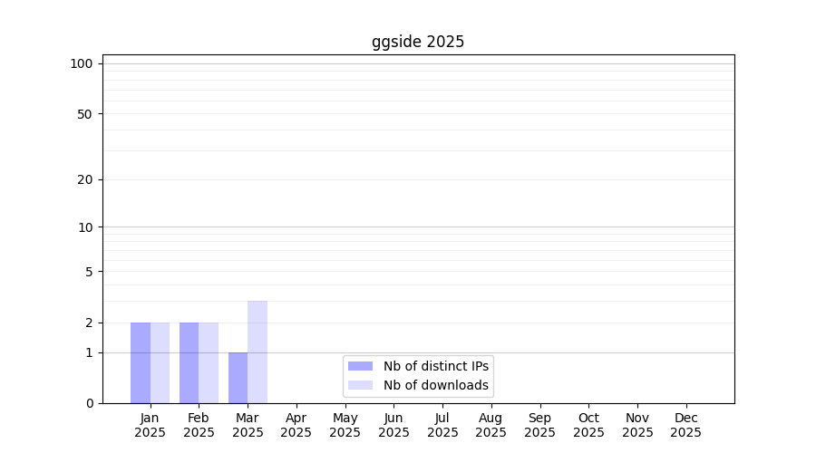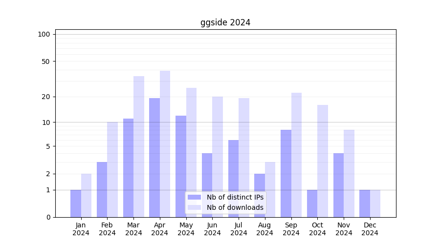 Number of downloads for workflow package ggside, year by year, from 2025 back to 2015 (years with no downloads are omitted):