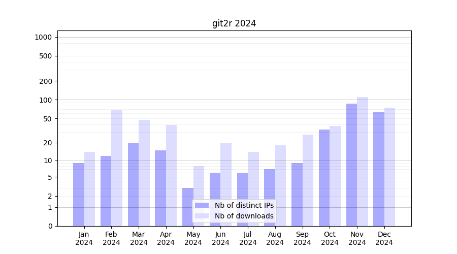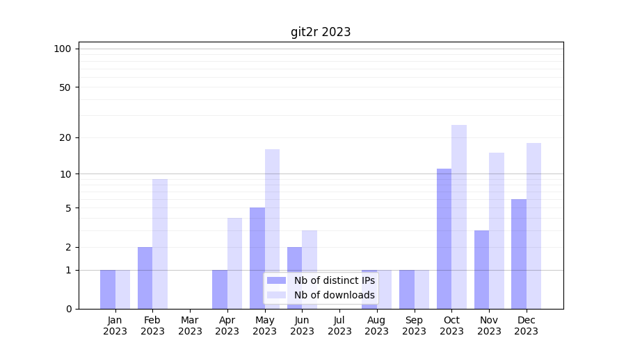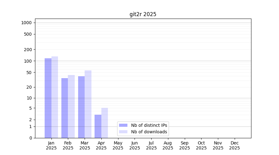 Number of downloads for workflow package git2r, year by year, from 2025 back to 2015 (years with no downloads are omitted):