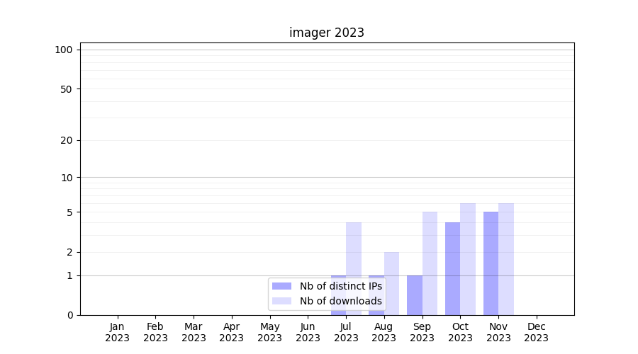 Number of downloads for workflow package imager, year by year, from 2025 back to 2015 (years with no downloads are omitted):