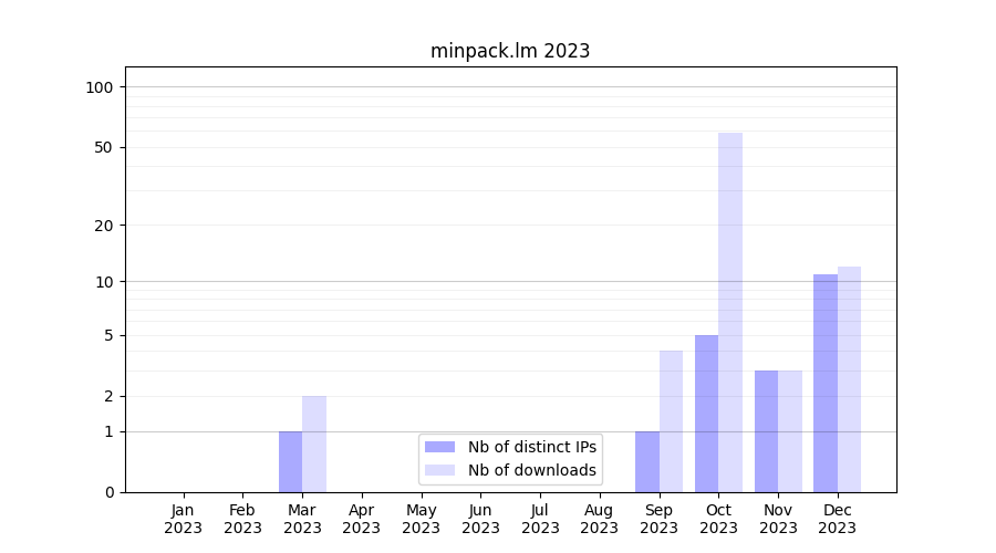 Number of downloads for workflow package minpack.lm, year by year, from 2025 back to 2015 (years with no downloads are omitted):