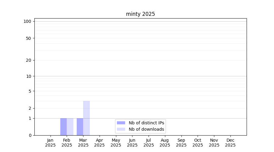 Number of downloads for workflow package minty, year by year, from 2025 back to 2015 (years with no downloads are omitted):