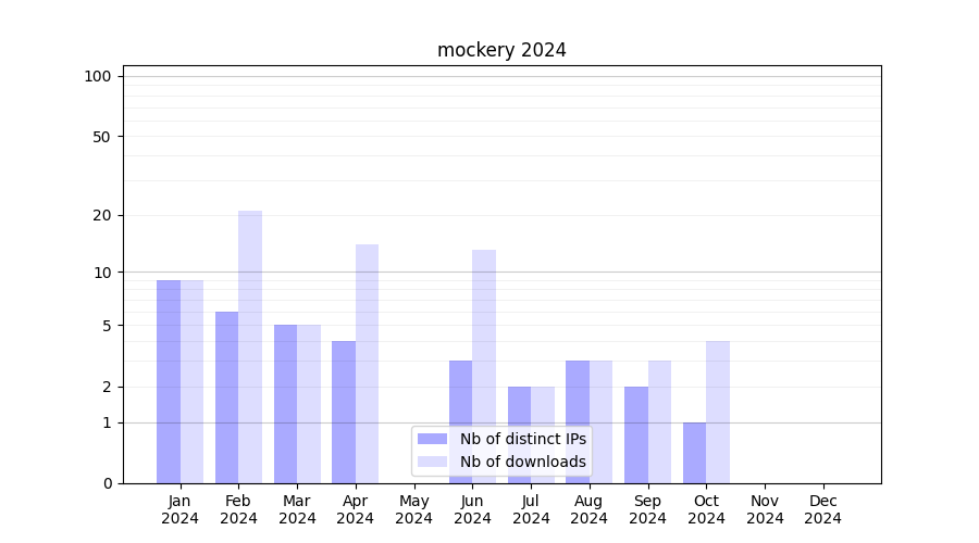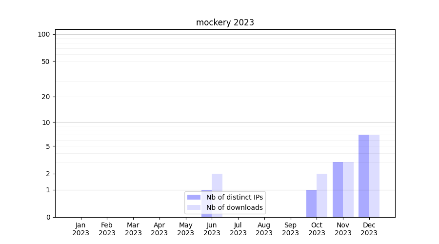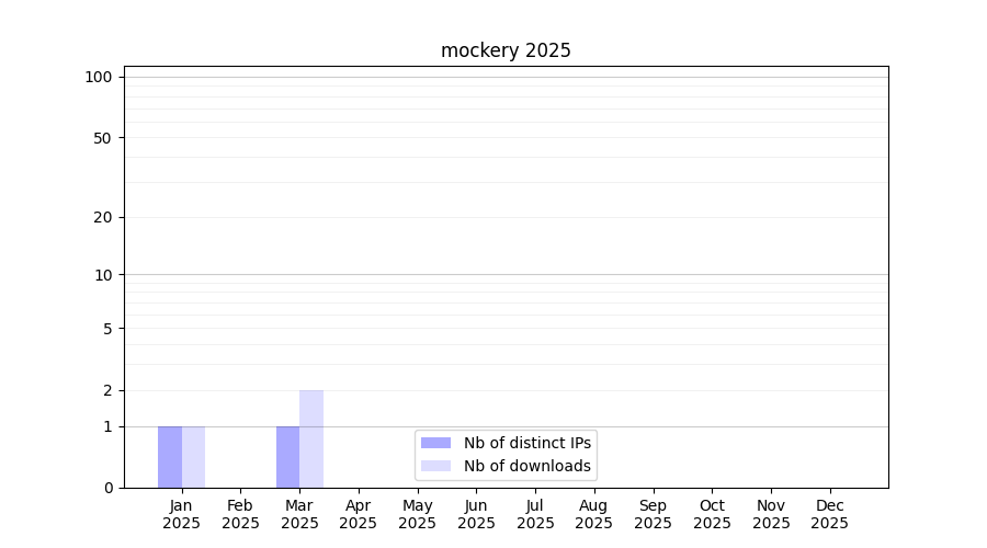 Number of downloads for workflow package mockery, year by year, from 2025 back to 2015 (years with no downloads are omitted):