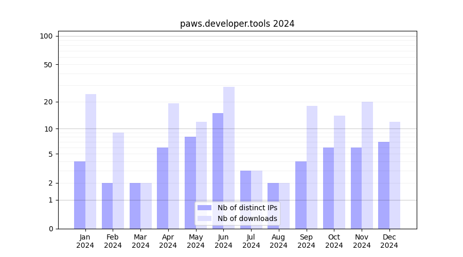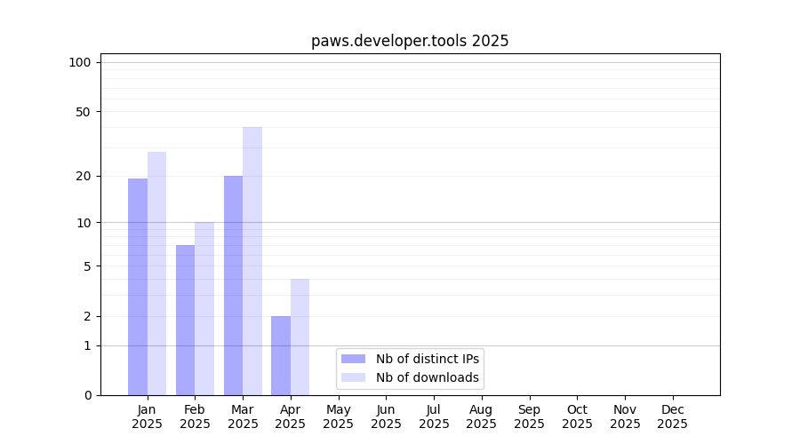 Number of downloads for workflow package paws.developer.tools, year by year, from 2025 back to 2015 (years with no downloads are omitted):