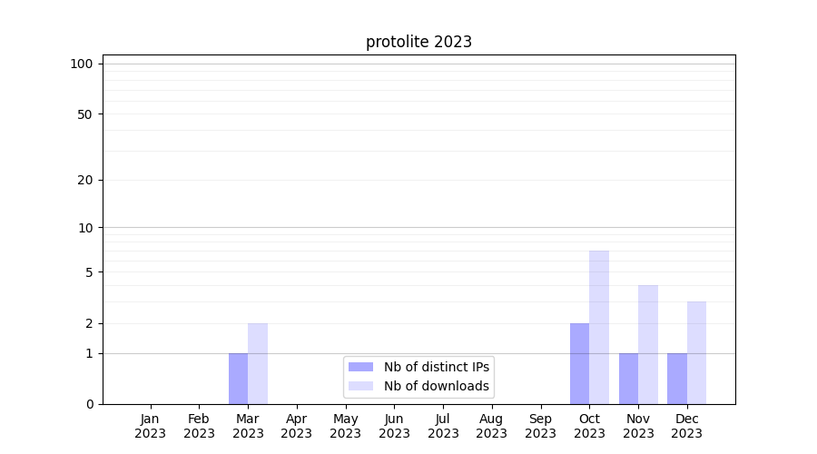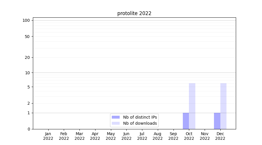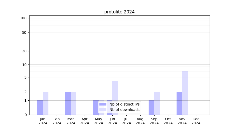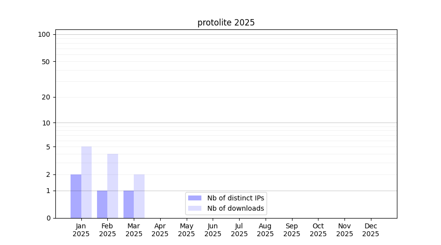 Number of downloads for workflow package protolite, year by year, from 2025 back to 2015 (years with no downloads are omitted):