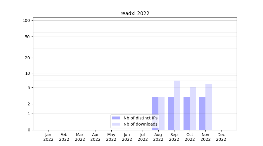 Number of downloads for workflow package readxl, year by year, from 2025 back to 2015 (years with no downloads are omitted):