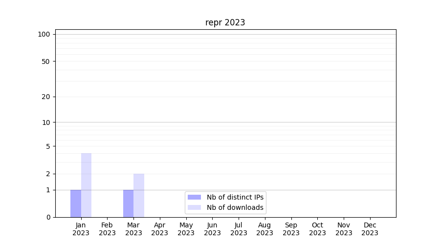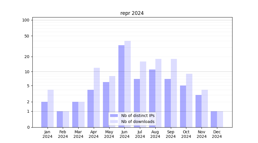 Number of downloads for workflow package repr, year by year, from 2025 back to 2015 (years with no downloads are omitted):
