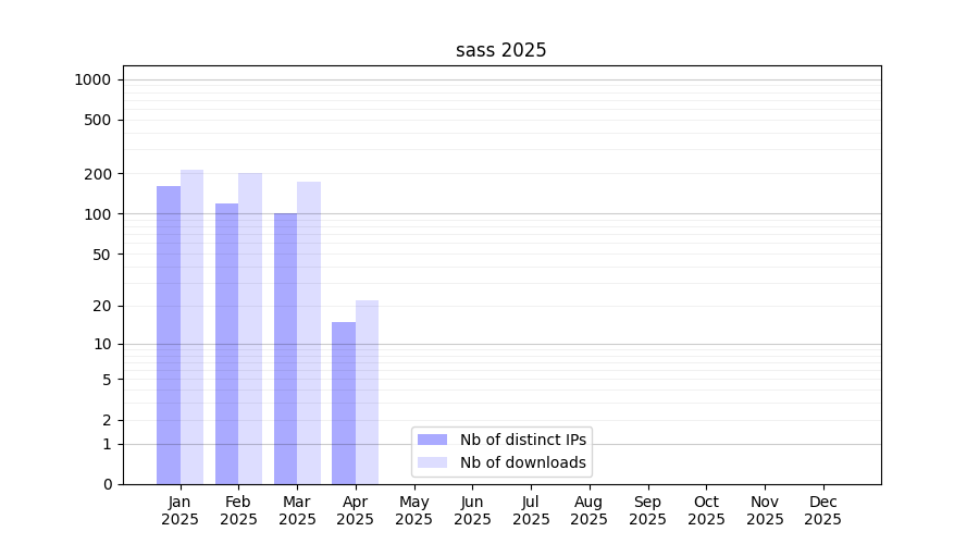 Number of downloads for workflow package sass, year by year, from 2025 back to 2015 (years with no downloads are omitted):
