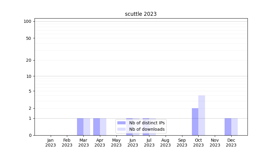 Number of downloads for workflow package scuttle, year by year, from 2025 back to 2015 (years with no downloads are omitted):