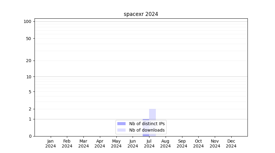 Number of downloads for workflow package spacexr, year by year, from 2025 back to 2015 (years with no downloads are omitted):