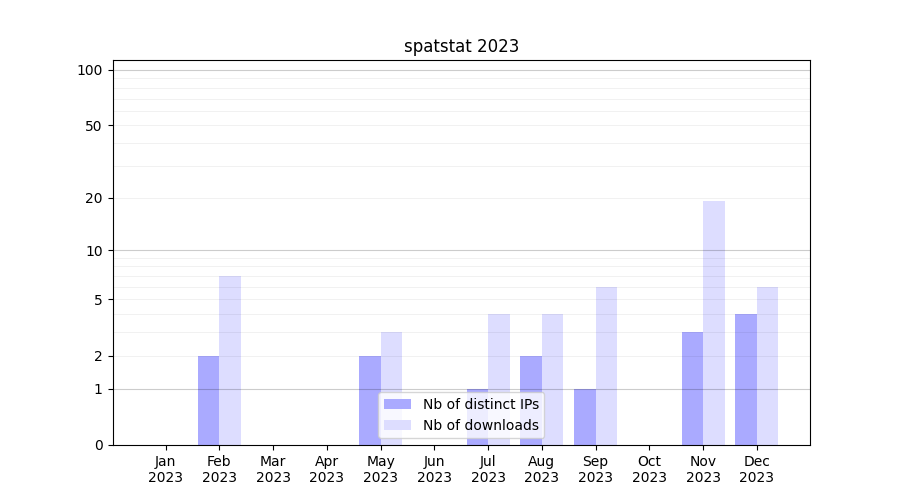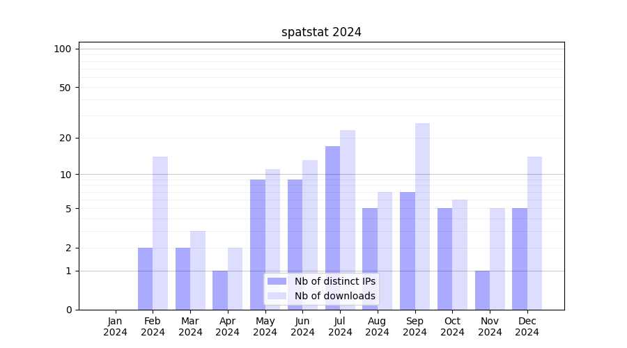 Number of downloads for workflow package spatstat, year by year, from 2025 back to 2015 (years with no downloads are omitted):