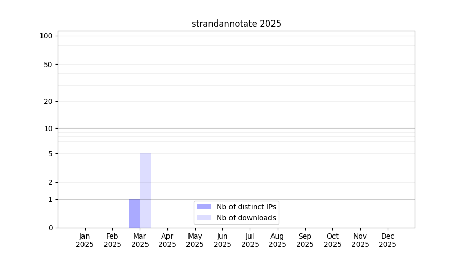 Number of downloads for workflow package strandannotate, year by year, from 2025 back to 2015 (years with no downloads are omitted):
