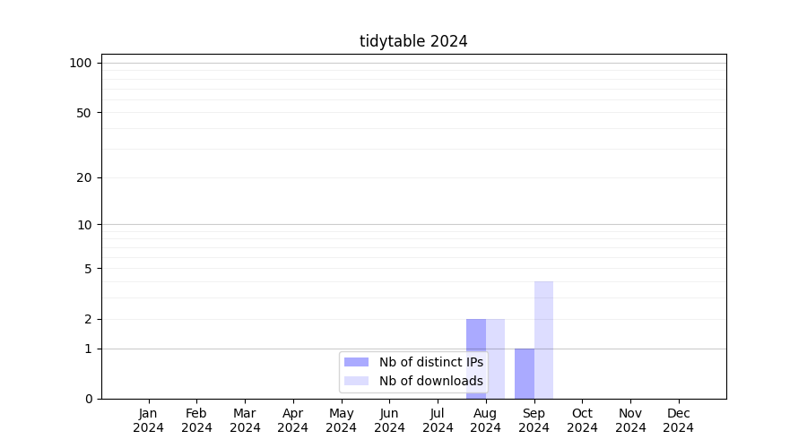 Number of downloads for workflow package tidytable, year by year, from 2025 back to 2015 (years with no downloads are omitted):