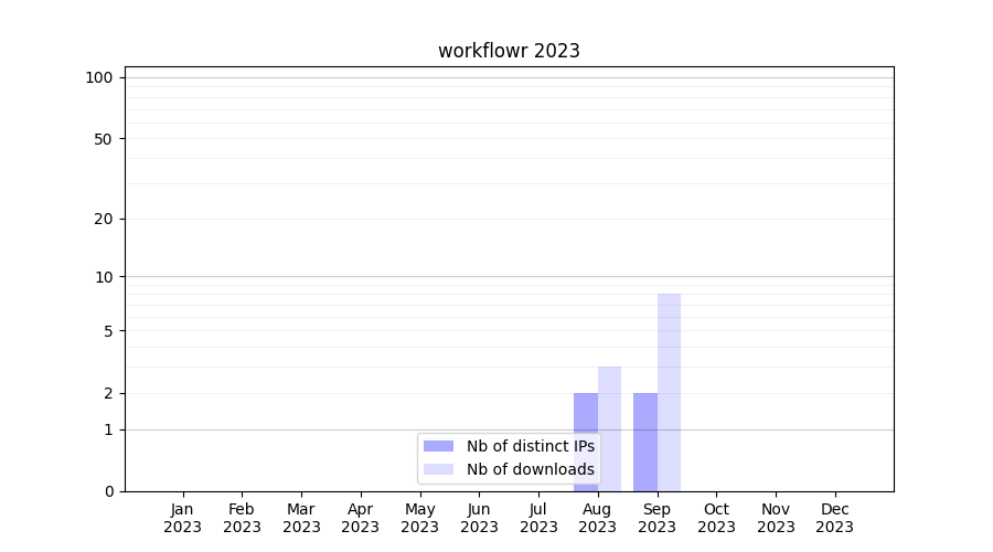 Number of downloads for workflow package workflowr, year by year, from 2025 back to 2015 (years with no downloads are omitted):
