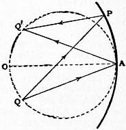 DIAMETER (from the Gr. διά, through, μέτρον, measure), in geometry, a line passing through the centre of a circle or conic section and terminated by the curve; the “principal diameters” of the ellipse and hyperbola coincide with the “axes” and are at right angles; “conjugate diameters” are such that each bisects chords parallel to the other. The diameter of a quadric surface is a line at the extremities of which the tangent planes are parallel. Newton defined the diameter of a curve of any order as the locus of the centres of the mean distances of the points of intersection of a system of parallel chords with the curve; this locus may be shown to be a straight line. The word is also used as a unit of linear measurement of the magnifying power of a lens or microscope.