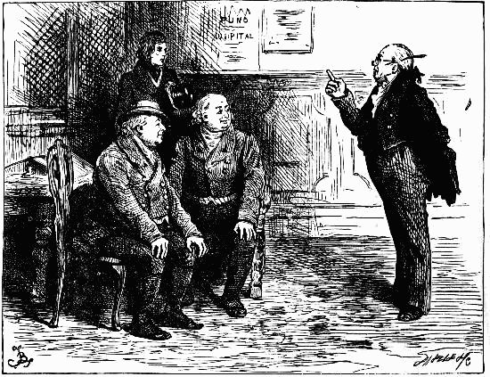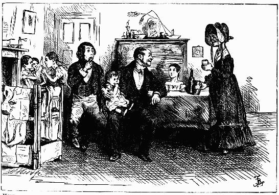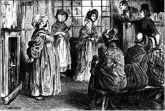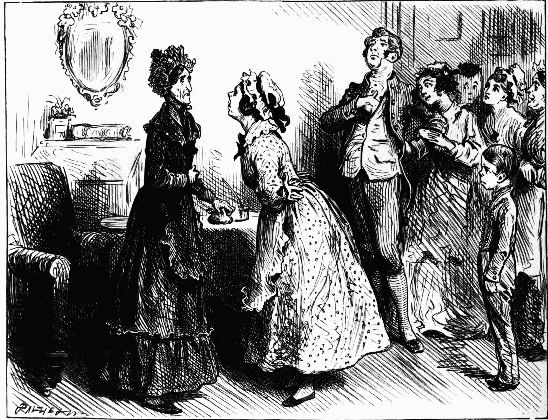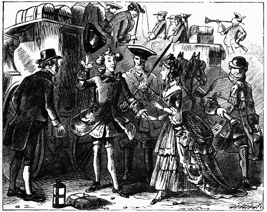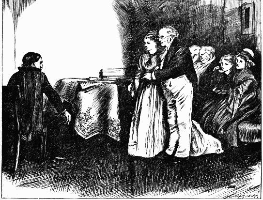 It happens, however, that there does exist a series of Dickens illustrations, now in some danger of being unduly neglected, in which the artists were wonderfully happy in preserving[x] the original features of Phiz and Cruikshank's interpretations, while they toned down the more extravagant details and brought imagination into closer harmony with reality. These were the illustrations to the square-shaped "Household Edition," published in 1870, just after the great novelist's death—and now reissued in this Dickens picture-book, in the hope that those who love the stories may like to possess in separate form what is, perhaps, the best pictorial accompaniment that the novels ever received. At the time of its first publication, the "Household Edition" enjoyed an enormous success. At the moment the name of Dickens was on every one's lips, and the fact that this splendidly illustrated reprint was issued in penny numbers and sixpenny parts placed it within reach of even the most humbly stocked purse. Its sale was stupendous, and the familiar green-covered pamphlets percolated through every town and village where the English tongue is spoken. The original copies may still be met with, under many a country timbered roof, carefully treasured as one of the most cherished household possessions.